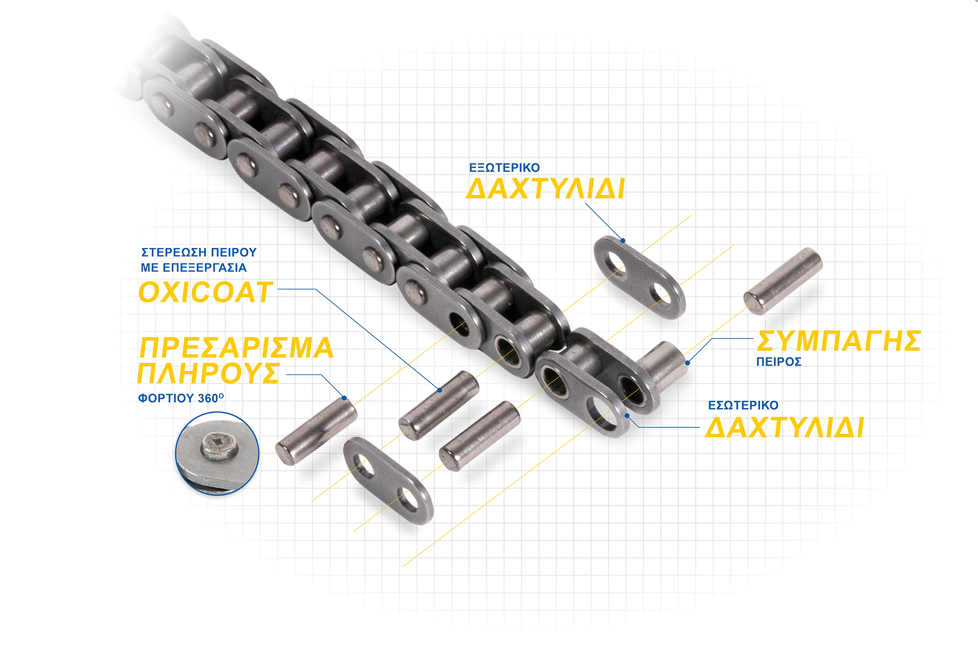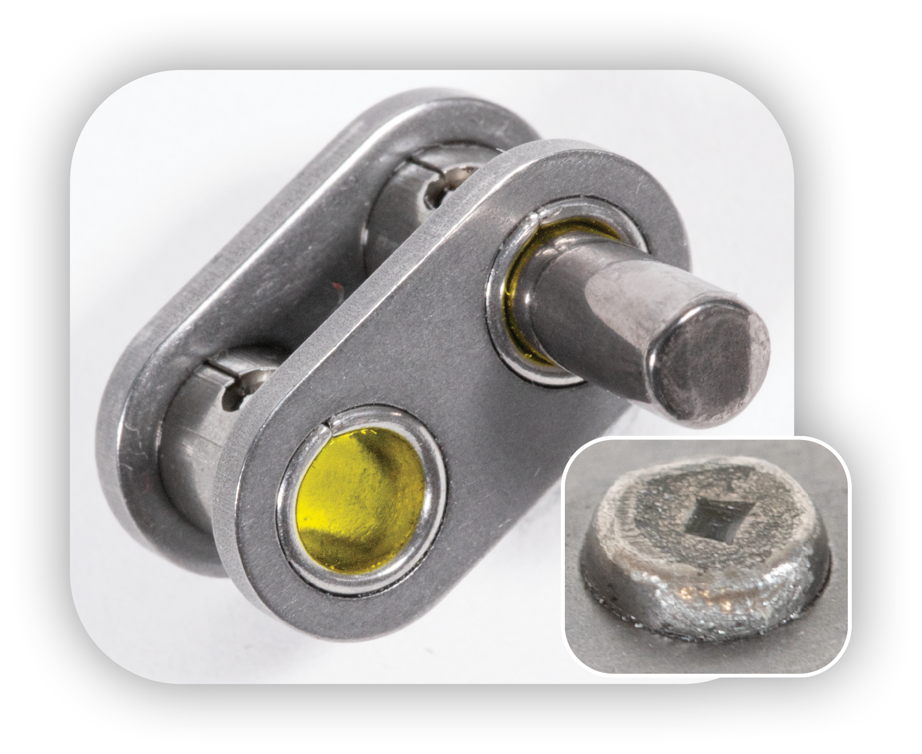 Οι πείροι της αλυσίδας ασφαλίζονται με μια διαδικασία δύο σταδίων. Στο πρώτο στάδιο εφαρμόζονται δύο πτυχώσεις στο εξωτερικό άκρο, ενώ στη συνέχεια προστίθεται ένα κεντρικά τοποθετημένο ανεστραμμένο πυραμιδοειδές σχέδιο. Ο συνδυασμός αυτός δημιουργεί μια παρεμβολή 360° τύπου “lock load”, που «κλειδώνει» απόλυτα τον πείρο στην εξωτερική πλάκα της αλυσίδας. Το αποτέλεσμα είναι άριστη κατανομή φορτίου και ενισχυμένη ανθεκτικότητα.